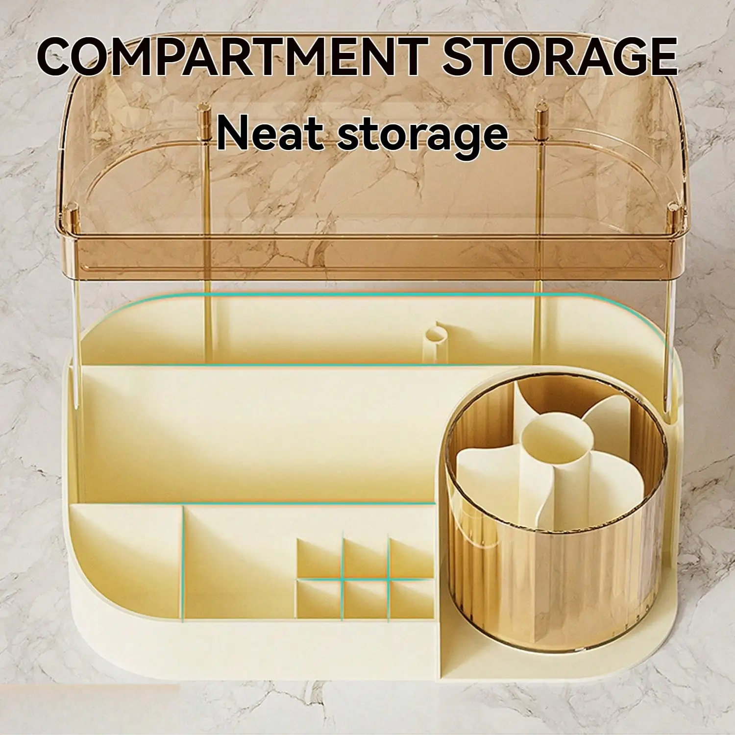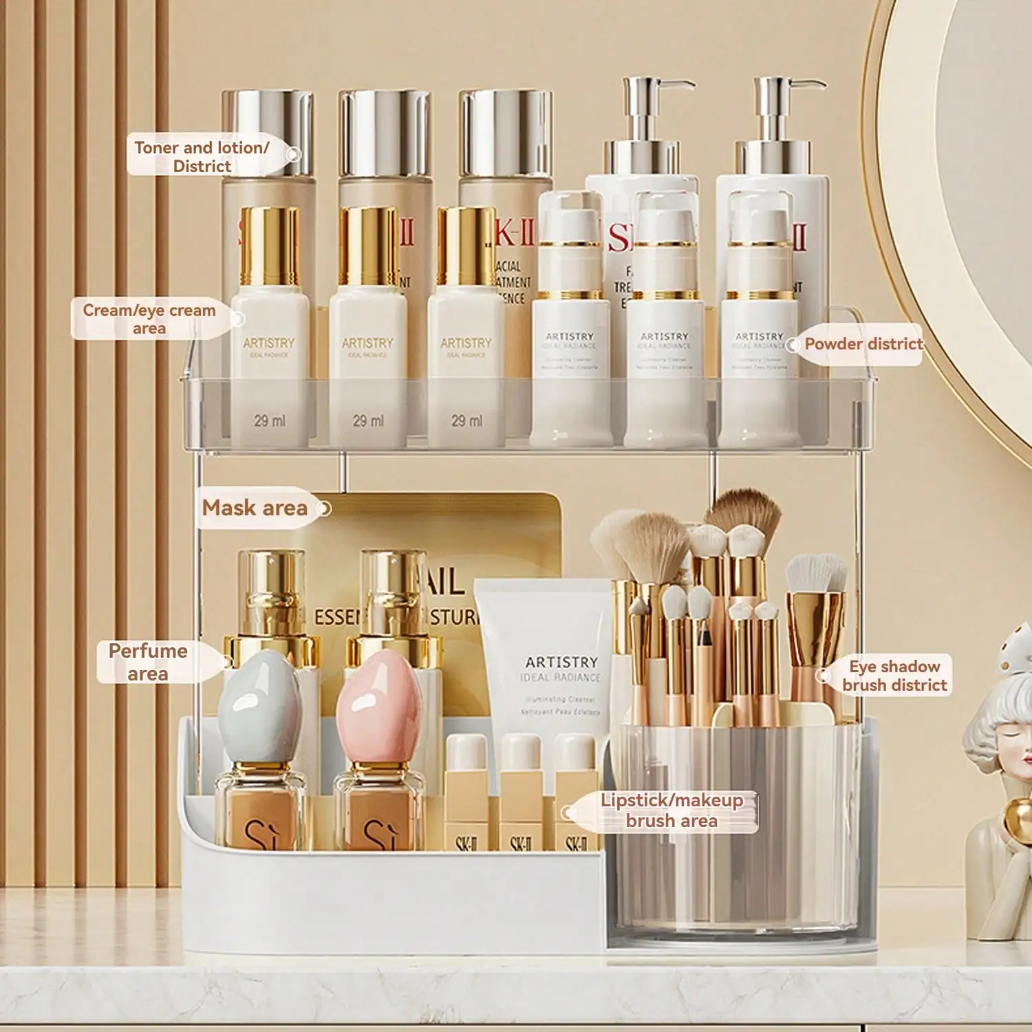 Two-layer large capacity design: Easily store all cosmetics and skin care products, double-layer spacious space, can accommodate various bottles, jars, makeup tools, etc., to meet daily skin care and makeup needs, keep the desktop clean and tidy.